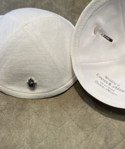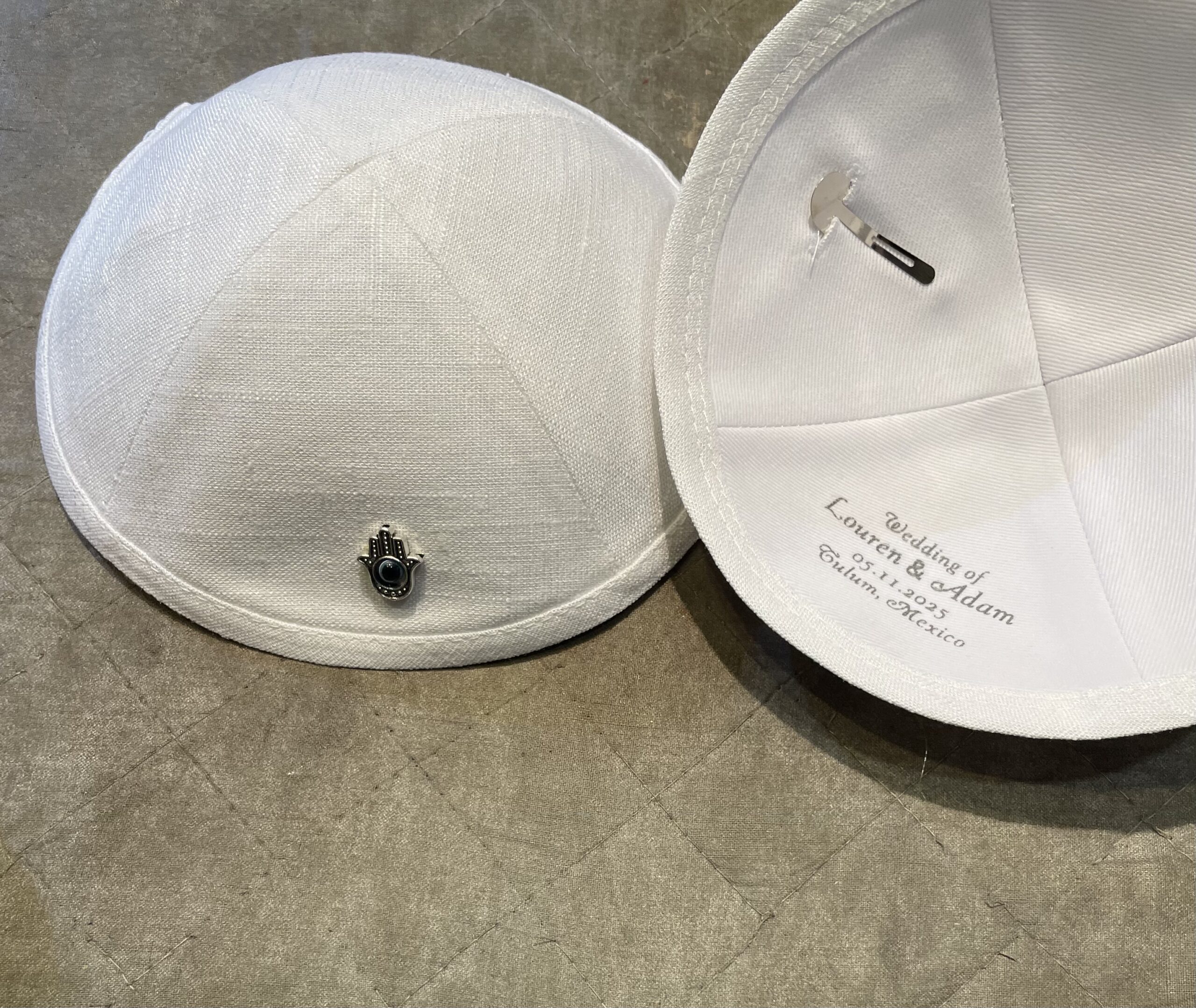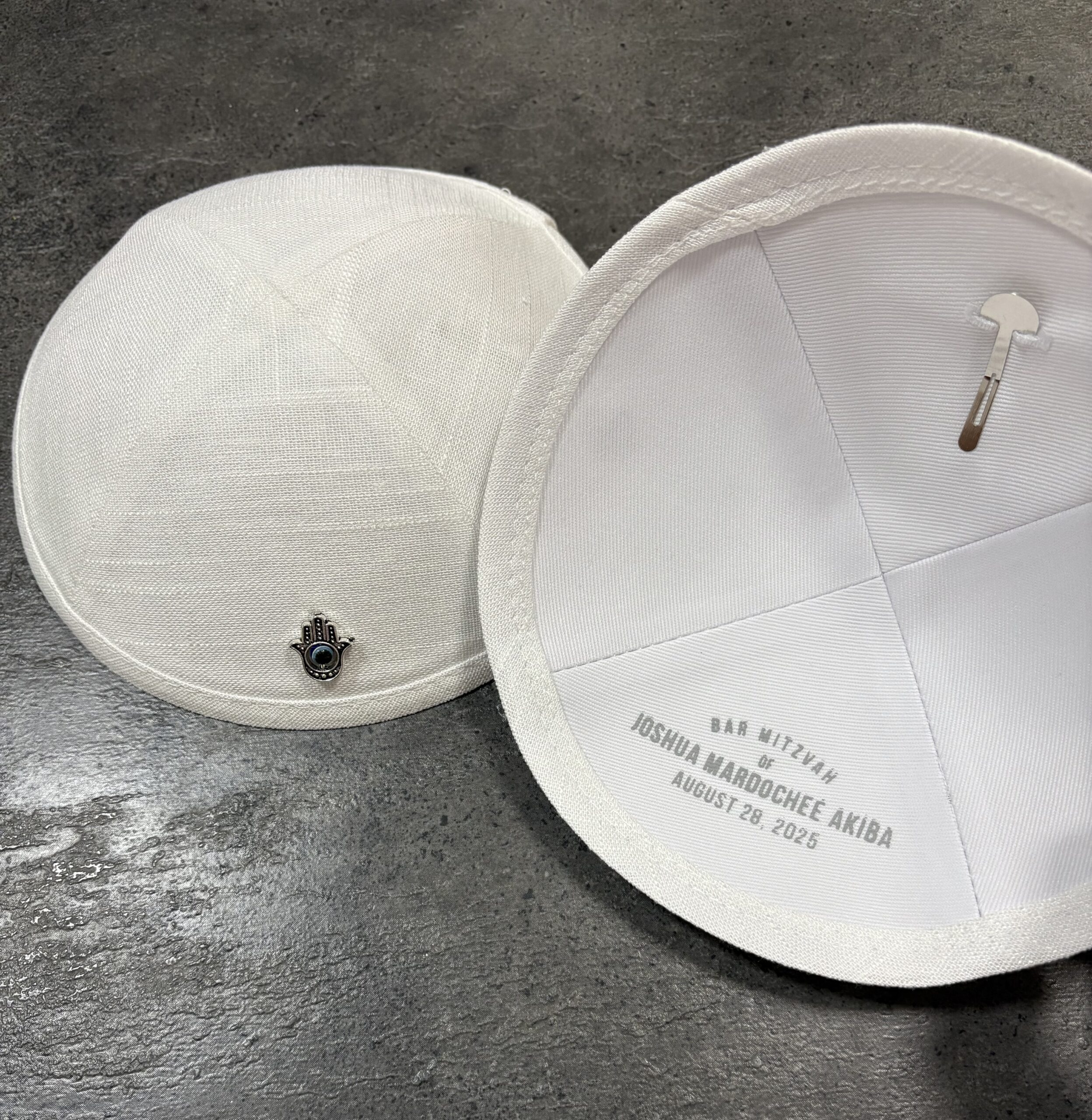כיפות פשתן בצבע לבן מהודרות לאירועים כולל הדפסה פנימית ותליון חמסה מהודר מבחוץ